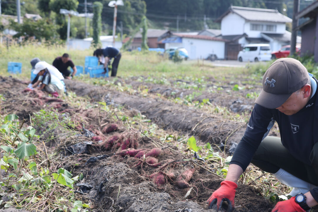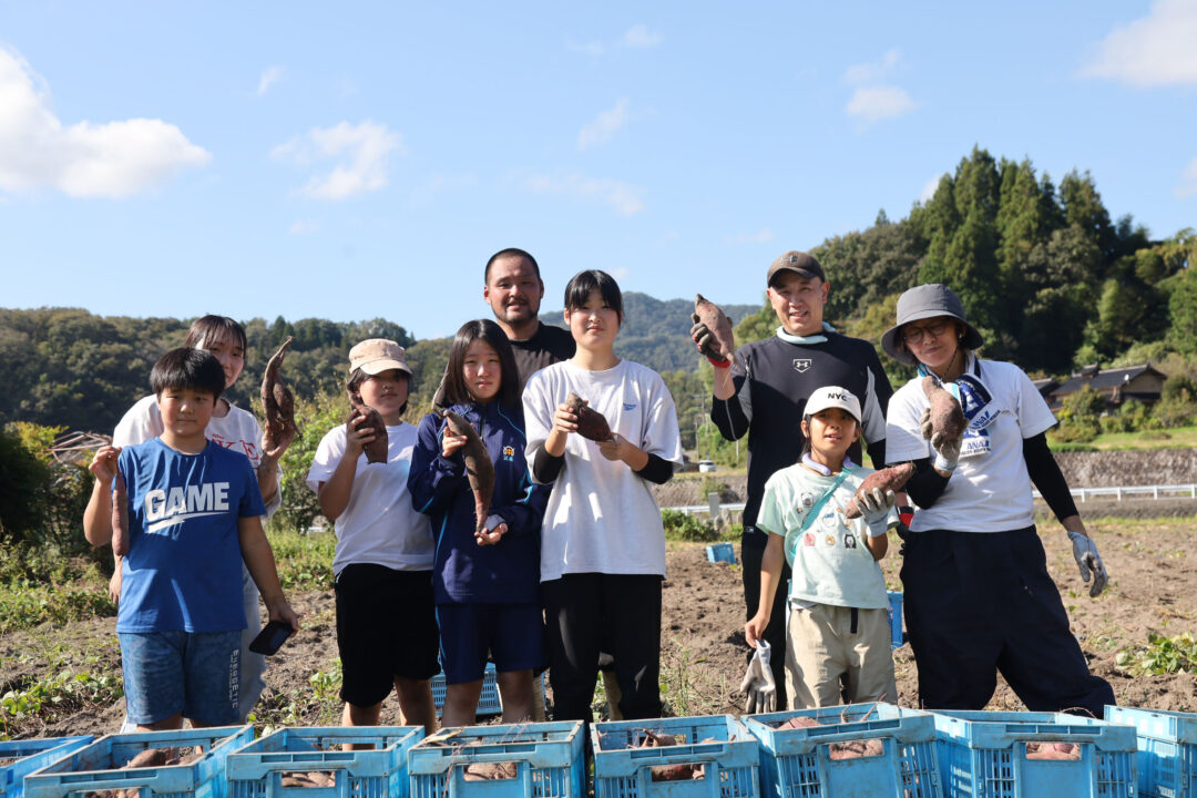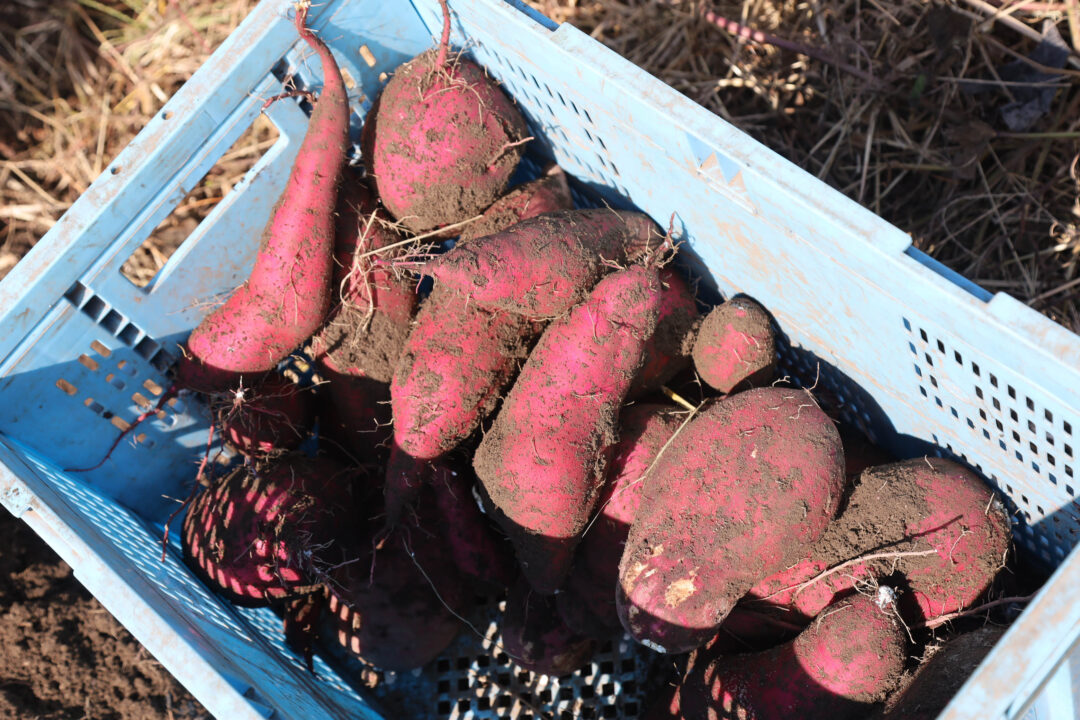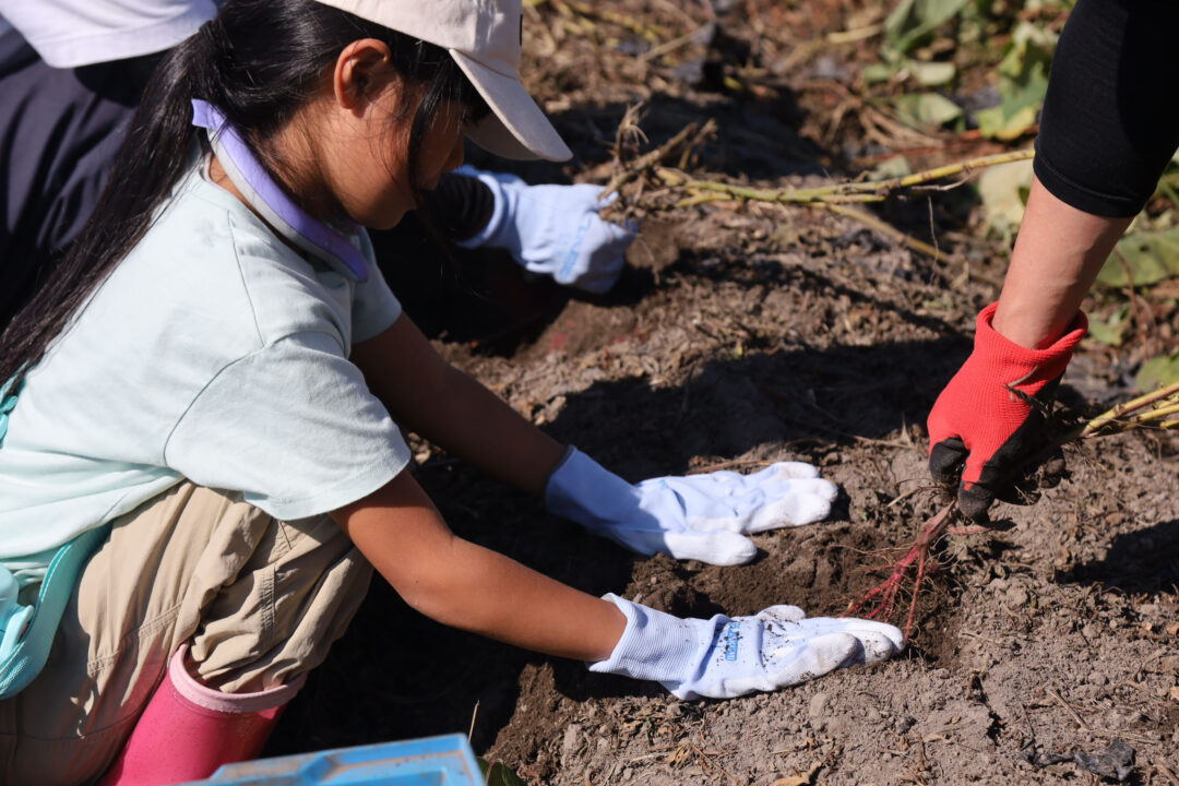 手で土をかき分けながら掘り進めると、大きなさつまいもが次々と顔を出し、「すごい!」「重たい〜!」とあちこちで笑顔と歓声があがりました。