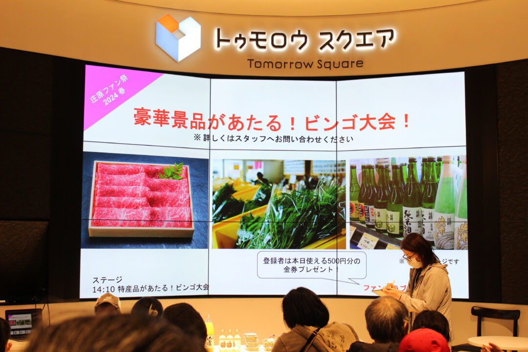 比婆牛の試食、地酒の試飲、特産品販売など、庄原の“おいしい”を気軽に楽しめます。