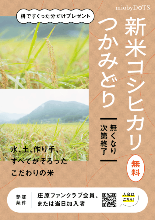 ファンクラブ会員特典企画として、 庄原自慢の新鮮なお米を枡でつかみ取りした分だけお持ち帰りいただけます。
