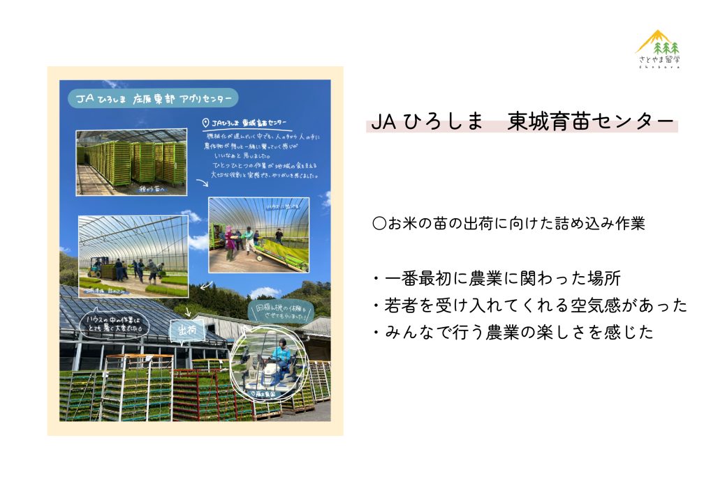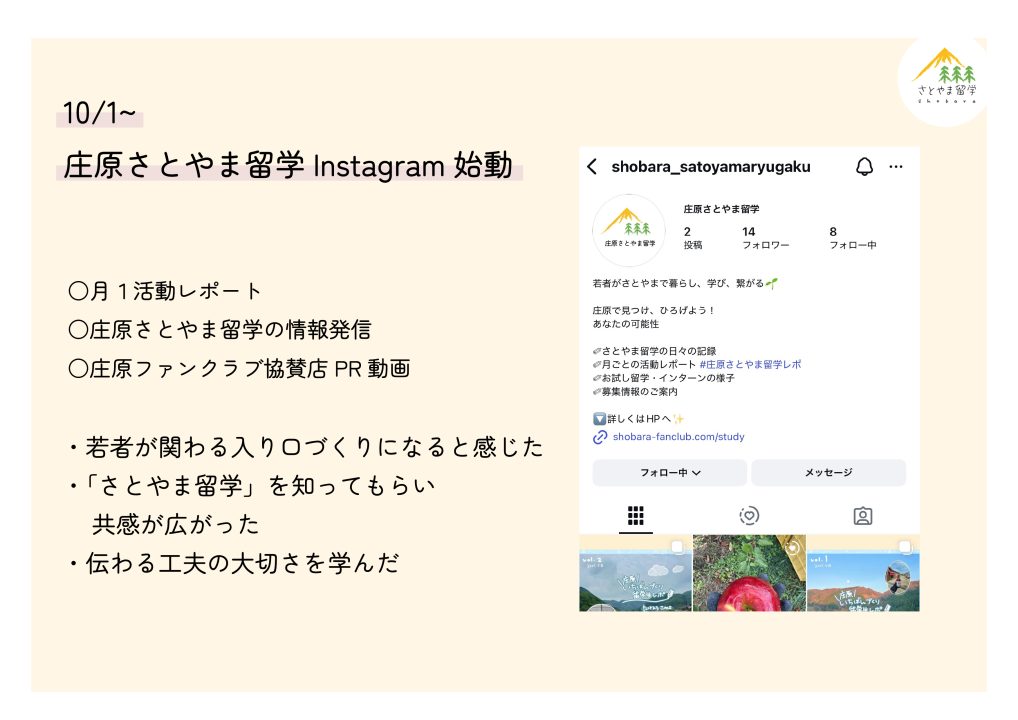 活動の軌跡として、まず紹介されたのは農作業体験です。「JAひろしま 東城育苗センター」でお米の苗の出荷に向けた詰め込み作業など、一番最初に農業に関わった場所。JAの方々が若者を温かく受け入れてくれる空気感の中で、みんなで行う農業の楽しさを実感しました。次に紹介されたのは広報活動です。10月1日からは「庄原さとやま留学」のInstagramアカウントを立ち上げ、月1活動レポートや、庄原ファンクラブ協賛店のPR動画などを発信。「さとやま留学」を知ってもらい共感を広げると共に、伝える工夫の大切さを学びました。
