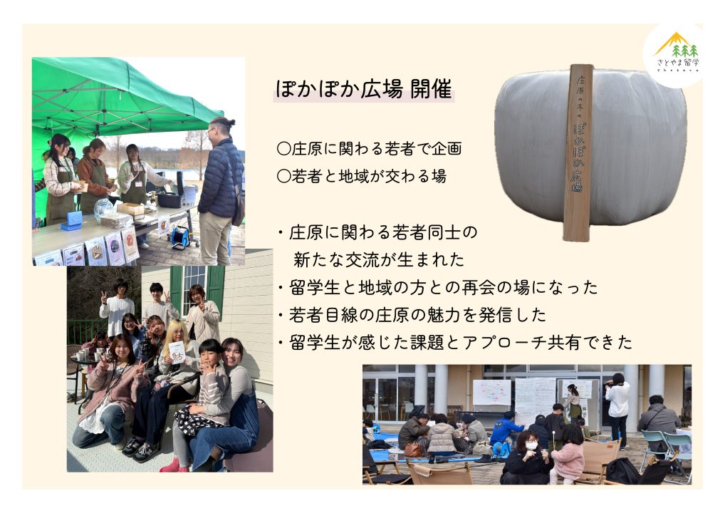 さらに、イベント企画・運営の経験も。庄原に関わる若者で企画・運営した「ぽかぽか広場」を開催。若者と地域が交わる場となり、新たな交流や留学生と地域の方の再会の場となりました。若者目線の庄原の魅力を発信し、課題とアプローチを共有できました。こうした活動を通して、竹廣さん自身にも大きな変化がありました。若者と地域の人が交わる楽しさを改めて感じたこと、農業の楽しさと達成感を実感し、好きになったこと、田舎に住みたい若者がいることを知り、その人たちが安心して楽しく地域に関われる方法を自分ごととして考えるようになったこと。