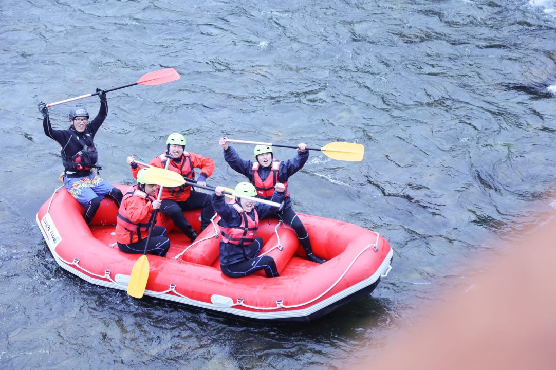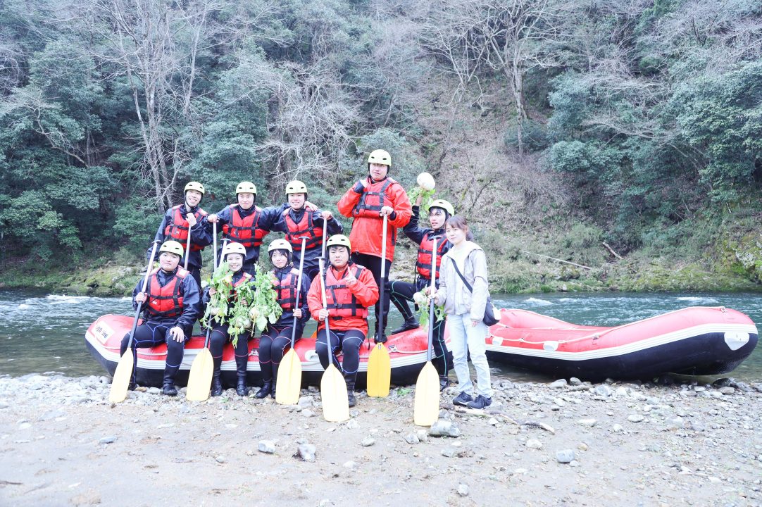 3日目の朝、息も白くなる寒さの中、ウェットスーツへと着替える、さとやま留学生たち。出発前に記念撮影をし、庄原市におけるラフティングの歴史を聞かせてもらった後、出発地点へと車で移動します。実際に自分たちでボートを膨らませ、準備運動と注意事項を聞いていよいよ川の中へ。やはりまだまだ冷たい川の水温。気合いの声をあげながらボートに乗り込んでいきました。