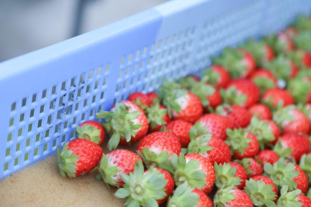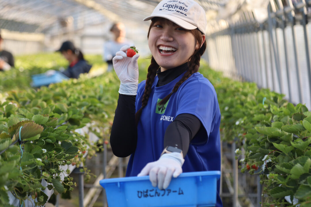 朝6時半から「ひばごんファーム」でいちごの収穫&選果作業。ハウスに広がる甘い香りに包まれながら、丁寧に作業を学びました。