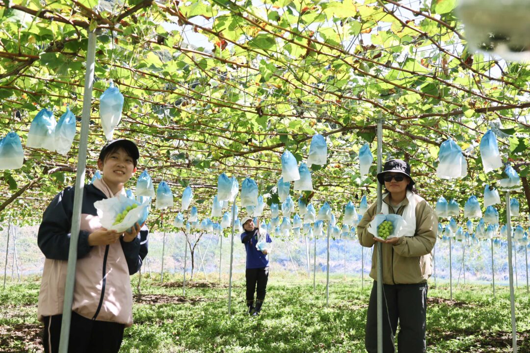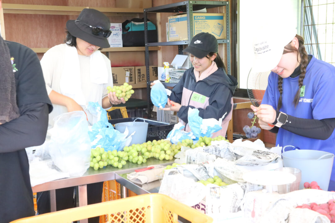 午後は「大佐vignoble」で初めてのぶどう収穫に挑戦。農場主の峠本さんも驚くほど手際よく、作業が想像以上に進みました。時折訪れるお客さんの接客もお手伝いし、普段とは違うにぎやかな農園になりました。