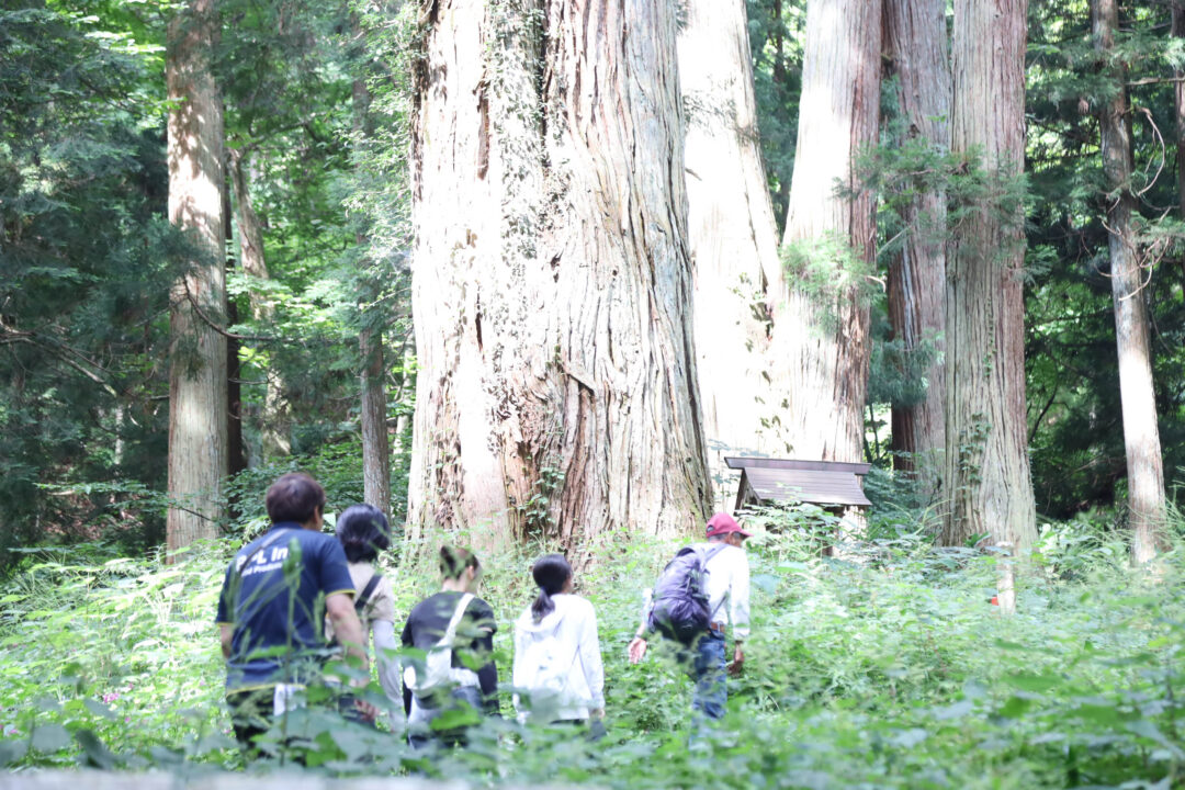 「熊野神社」を「ツイハラの会」の岡田さんにガイドしていただきながら散策。そびえ立つ巨木群に圧倒され、神聖な空気を全身で感じました。